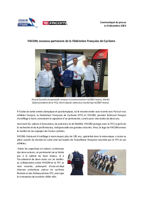 À l'aube de cette année olympique et paralympique, où le monde entier sera tourné vers Paris et ses athlètes français, la Fédération Française de Cyclisme (FFC) et Facom, premier fabricant franças d'outillage à main, annoncent la signature d'un partenariat, conclu pour une durée de 2 ans.