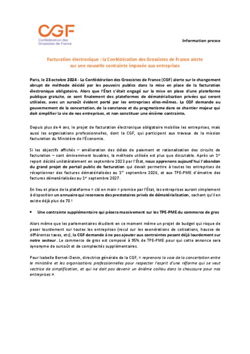 Facturation électronique : La CGF alerte sur une nouvelle contrainte imposée aux entreprises