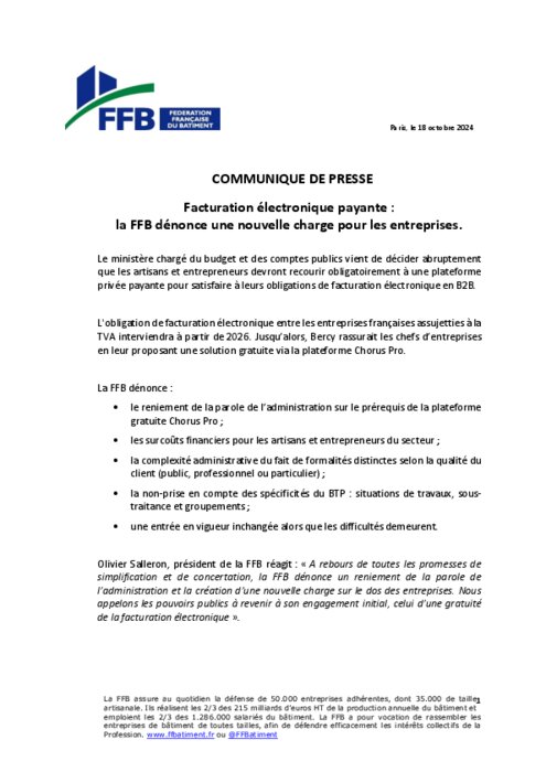 Olivier Salleron, président de la FFB réagit : « A rebours de toutes les promesses de simplification et de concertation, la FFB dénonce un reniement de la parole de l’administration et la création d’une nouvelle charge sur le dos des entreprises. Nous appelons les pouvoirs publics à revenir à son engagement initial, celui d’une gratuité de la facturation électronique ».