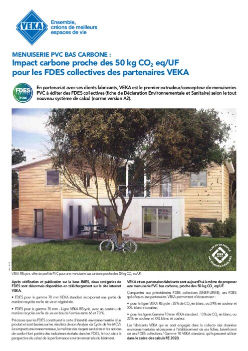 Industriels 19 avril 2023 - 15:24 En partenariat avec ses clients fabricants, VEKA est le premier extrudeur/concepteur de menuiseries PVC à éditer des FDES collectives (fiche de Déclaration Environnementale et Sanitaire) selon le tout nouveau système de calcul (norme version A2). PDF (335 Ko) Télécharger
