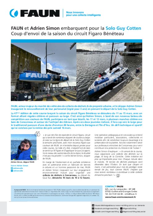 Industriels 06 mars 2024 - 12:35 FAUN, acteur majeur du marché des véhicules de collecte de déchets & de propreté urbaine, et le skipper Adrien Simon inaugurent le renouvellement de leur partenariat (signé pour 3 ans) en prenant le départ de la Solo Guy Cotten. PDF (329 Ko) Télécharger