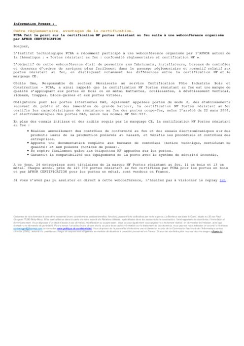Institutionnels 22 avril 2024 - 16:43 L’Institut technologique FCBA a récemment participé à une webconférence organisée par l’AFNOR autour de la thématique : « Portes résistant au feu : conformité règlementaire et certification NF ». PDF (47 Ko) Télécharger