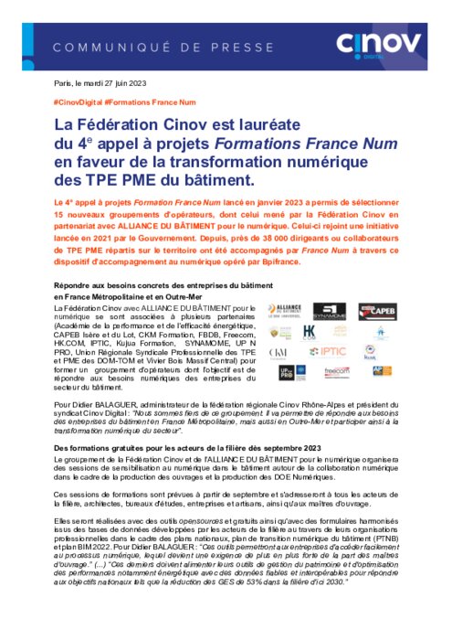 Le 4e appel à projets Formation France Num lancé en janvier 2023 a permis de sélectionner 15 nouveaux groupements d’opérateurs, dont celui mené par la Fédération Cinov en partenariat avec ALLIANCE DU BÂTIMENT pour le numérique. Celui-ci rejoint une initiative lancée en 2021 par le Gouvernement. Depuis, près de 38 000 dirigeants ou collaborateurs de TPE PME répartis sur le territoire ont été accompagnés par France Num à travers ce dispositif d’accompagnement au numérique opéré par Bpifrance.