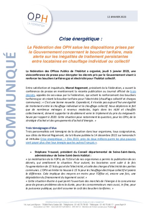 La Fédération des Offices Publics de l’Habitat a organisé, jeudi 5 janvier 2023, une visioconférence de presse pour décrypter les décrets pris par le Gouvernement visant à renforcer les boucliers tarifaires gaz et électricité pour l’habitat collectif.