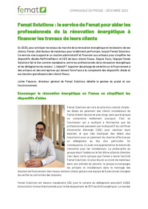 dispositifs d'aides MaPrimeRénov’ et CEE de leurs clients finaux. Depuis 3 ans, l’équipe Femat