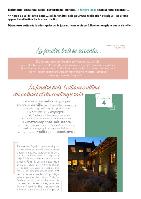 Esthétique, personnalisable, performante, durable, la fenêtre bois a bien des atouts pour séduire les projets les plus exigeants. Mais la connaît-on vraiment ? N'a-t-on pas sur elle des idées préconçues ? Pour le savoir, la fenêtre bois se raconte en 5 histoires actuelles.