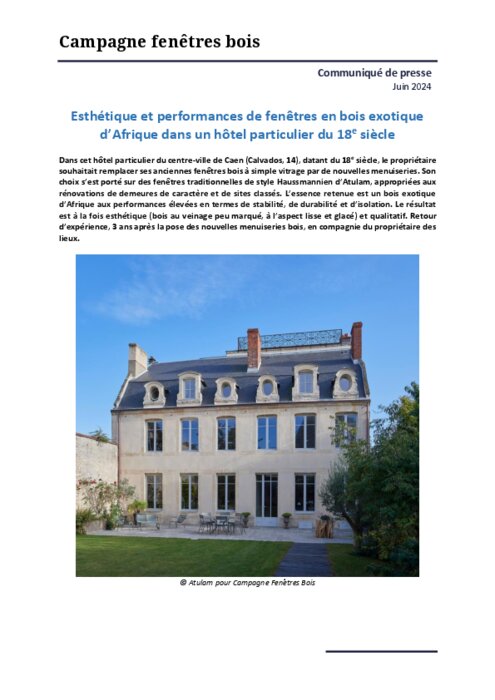 Dans cet hôtel particulier du centre-ville de Caen (Calvados, 14), datant du 18e siècle, le propriétaire souhaitait remplacer ses anciennes fenêtres bois à simple vitrage par de nouvelles menuiseries. Son choix s’est porté sur des fenêtres traditionnelles de style Haussmannien d’Atulam, appropriées aux rénovations de demeures de caractère et de sites classés. L’essence retenue est un bois exotique d’Afrique aux performances élevées en termes de stabilité, de durabilité et d’isolation