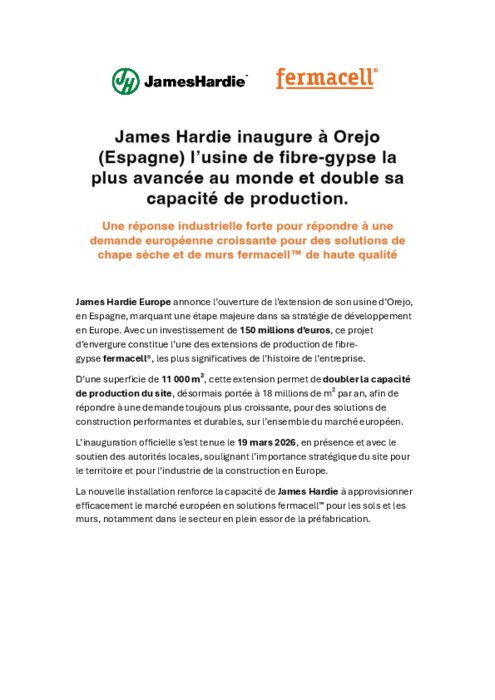 James Hardie Europe annonce l’ouverture de l’extension de son usine d’Orejo, en Espagne, marquant une étape majeure dans sa stratégie de développement en Europe. Avec un investissement de 150 millions d’euros, ce projet d’envergure constitue l’une des extensions de production de fibre-gypse fermacell, les plus significatives de l’histoire de l’entreprise.
