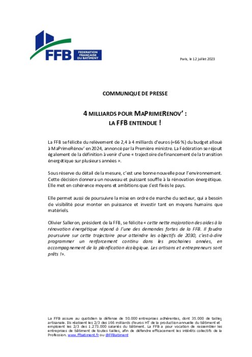 La FFB se félicite du relèvement de 2,4 à 4 milliards d'euros (+66 %) du budget alloué à MaPrimeRénov’ en 2024, annoncé par la Première ministre. La Fédération se réjouit également de la définition à venir d’une « trajectoire de financement de la transition énergétique sur plusieurs années ». Sous réserve du détail de la mesure, c’est une bonne nouvelle pour l’environnement. Cette décision donnera un nouveau et puissant souffle à la rénovation énergétique.