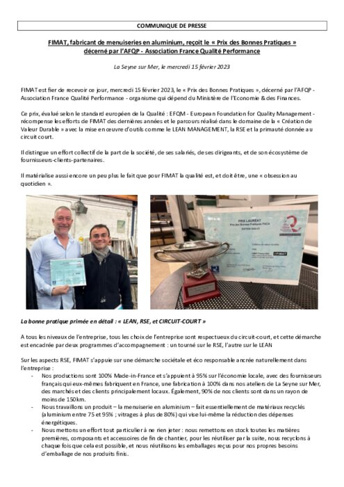 Ce prix, évalué selon le standard Européen de la Qaulité : EFQM - European Foundation for Quality Management - récompense les efforts de la société FIMAT des dernières années et le parcours réalisé dans le domaine de la "Création de Valeur Durable" avec la mise en oeuvre d'outils comme le Lean Management, la RSE et la primauté donnée au circuit court.