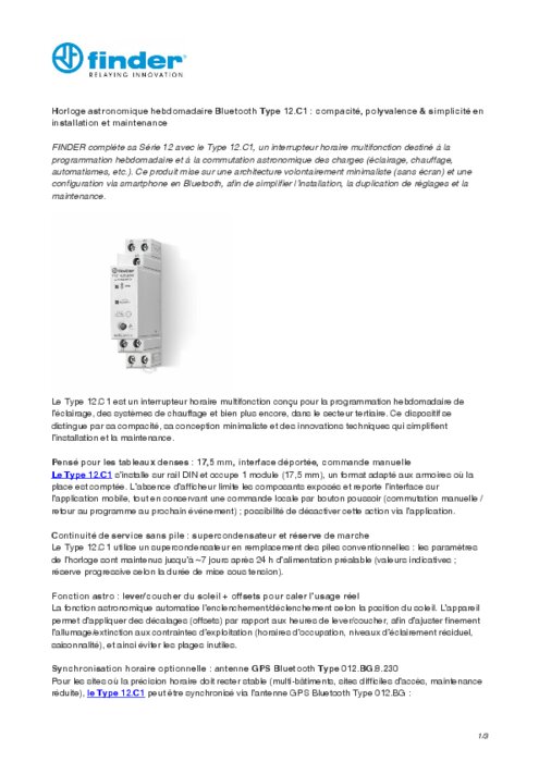 FINDER complète sa Série 12 avec le Type 12.C1, un interrupteur horaire multifonction destiné à la programmation hebdomadaire et à la commutation astronomique des charges (éclairage, chauffage, automatismes, etc.). Ce produit mise sur une architecture volontairement minimaliste (sans écran) et une configuration via smartphone en Bluetooth, afin de simplifier l’installation, la duplication de réglages et la maintenance.