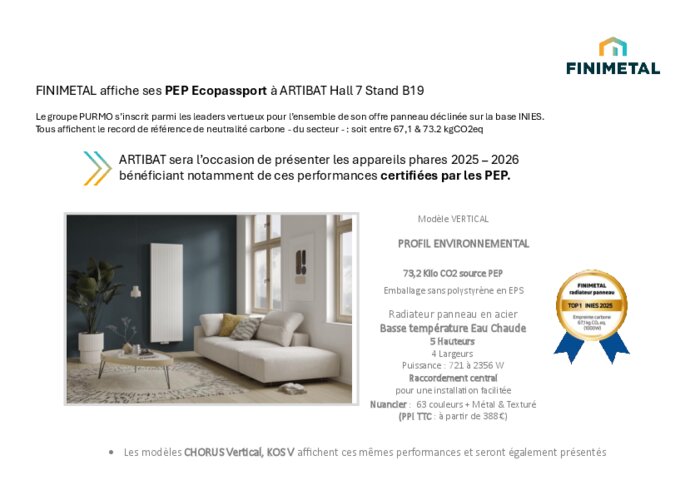 Le groupe Purmo s’inscrit parmi les leaders vertueux pour l’ensemble de son offre panneau déclinée sur la base Inies. Tous affichent le record de référence de neutralité carbone - du secteur - : soit entre 67,1 & 73.2 kgCO2eq