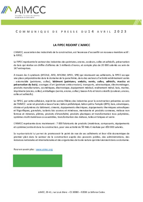 L’AIMCC, association des industriels de la construction, est heureuse d’accueillir un nouveau membre actif : la FIPEC. La FIPEC représente le secteur des industries des peintures, encres, couleurs, colles et adhésifs, préservation du bois qui réalise un chiffre d’affaires de 5 milliards d’euros, et compte plus de 20 000 salariés au sein de 147 entreprises.