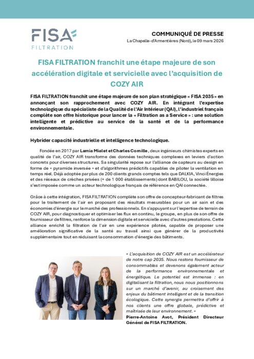 FISA FILTRATION accélère sa croissance avec l'acquisition de COZY AIR