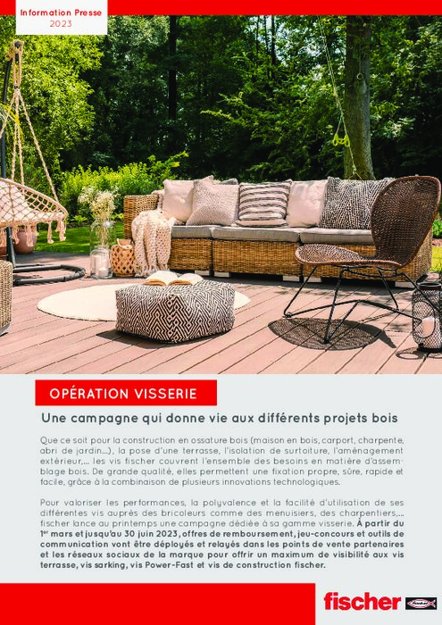 Pour valoriser les performances, la polyvalence et la facilité d’utilisation de ses différentes vis auprès des bricoleurs comme des menuisiers, des charpentiers,... fischer lance au printemps une campagne dédiée à sa gamme visserie. À partir du 1er mars et jusqu’au 30 juin 2023, offres de remboursement, jeu-concours et outils de communication vont être déployés et relayés dans les points de vente partenaires et les réseaux sociaux de la marque pour offrir un maximum de visibilité aux vis.