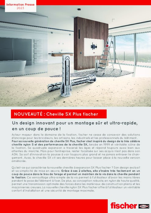 Acteur majeur dans le domaine de la fixation, fischer ne cesse de concevoir des solutions d’ancrage pour les bricoleurs, les artisans, les industriels et les professionnels du bâtiment. Pour sa nouvelle génération de cheville SX Plus, fischer s’est inspiré du design de la très célèbre cheville nylon S et des performances de la cheville SX, lancée en 1999 et véritable icône de la fixation. Sa quadruple expansion a traversé les âges et répond toujours aussi bien aux attentes du marché.