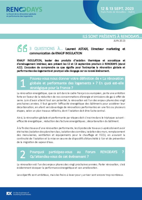 3 questions à Laurent ASTAIX, Directeur marketing et communication de Knauf Insulation. Knauf Insulation, leader des produits d’isolation thermique et acoustique et d’aménagement intérieur, sera présent les 12 et 13 septembre prochain à RENODAYS (stand A22). L’occasion de comprendre ce que signifie pour l’entreprise la rénovation globale et performantes des logements et pourquoi elle s’engage sur ce nouvel événement.