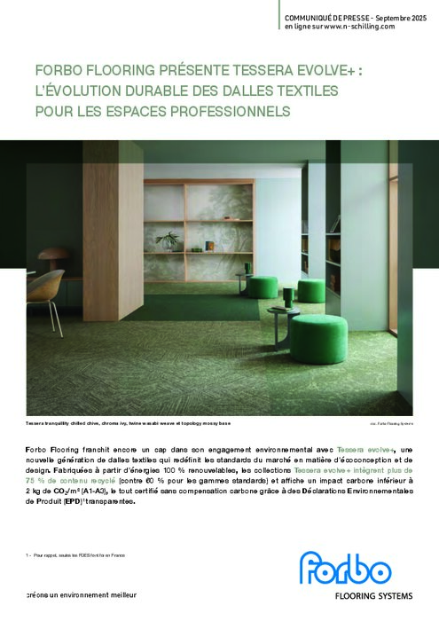 Forbo Flooring franchit encore un cap dans son engagement environnemental avec Tessera evolve+, une nouvelle génération de dalles textiles qui redéfinit les standards du marché en matière d’écoconception et de design. Fabriquées à partir d’énergies 100 % renouvelables, les collections Tessera evolve+ intègrent plus de 75 % de contenu recyclé (contre 60 % pour les gammes standards) et affiche un impact carbone inférieur à 2 kg de CO₂/m² (A1-A3), le tout certifié sans compensation carbone grâce à des Déclarations Environnementales de Produit (EPD) transparentes.