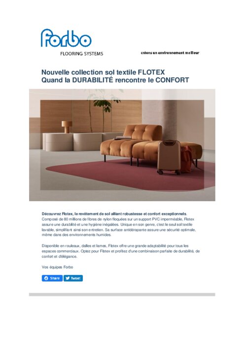 Composé de 80 millions de fibres de nylon floquées sur un support PVC imperméable, Flotex assure une durabilité et une hygiène inégalées. Unique en son genre, c'est le seul sol textile lavable, simplifiant ainsi son entretien. Sa surface antidérapante assure une sécurité optimale, même dans des environnements humides.