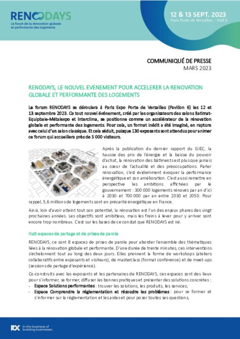 Le forum Renodays se déroulera à Paris Expo Porte de Versailles (Pavillon 6) les 12 et 13 septembre 2023. Ce tout nouvel événement, créé par les organisateurs des salons Batimat-Equipbaie-Métalexpo et Interclima, se positionne comme un accélérateur de la rénovation globale et performante des logements. Pour cela, un format inédit a été imaginé, en rupture avec celui d’un salon classique.130 exposants sont attendus pour animer cet événement qui accueillera près de 5 000 visiteurs.