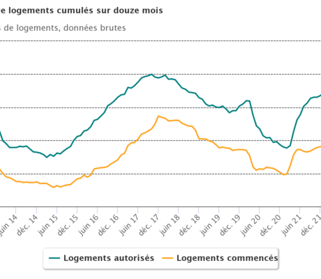 En 2022, 482 200 logements ont été autorisés à la construction, soit 14 300 de plus qu’en 2021 (+ 3,1 %). Dans le même temps, on estime que 376 200 logements ont été mis en chantier, soit 14 200 de moins (- 3,7 %) que sur l'année 2021. Si on prend comme point de comparaison les 12 mois précédant la crise sanitaire (mars 2019 à février 2020), le nombre de logements autorisés au cours des 12 derniers mois est supérieur de 4,8 %, celui de logements commencés est inférieur de 2,2 %.
