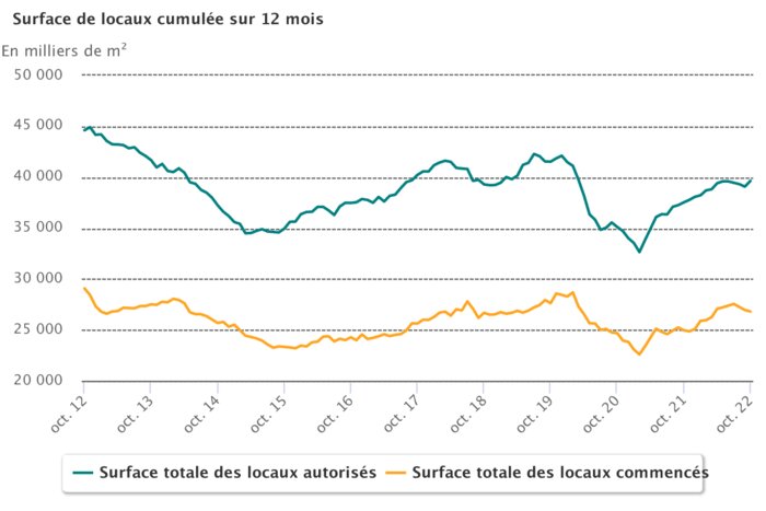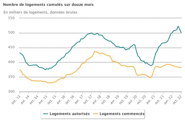 De novembre 2021 à octobre 2022, 500 700 logements ont été autorisés à la construction, soit 34 900 de plus qu’au cours des 12 mois précédents (+ 7,5 %).
