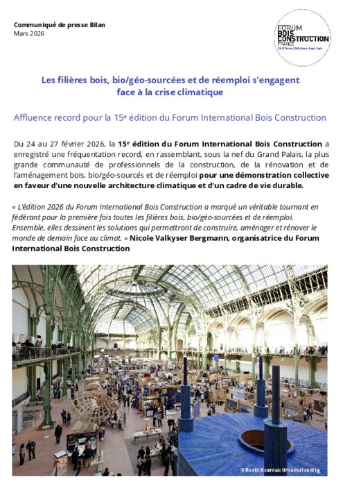Du 24 au 27 février 2026, la 15ᵉ édition du Forum International Bois Construction a enregistré une fréquentation record, en rassemblant, sous la nef du Grand Palais, la plus grande communauté de professionnels de la construction, de la rénovation et de l’aménagement bois, bio/géo-sourcés et de réemploi pour une démonstration collective en faveur d’une nouvelle architecture climatique et d’un cadre de vie durable.