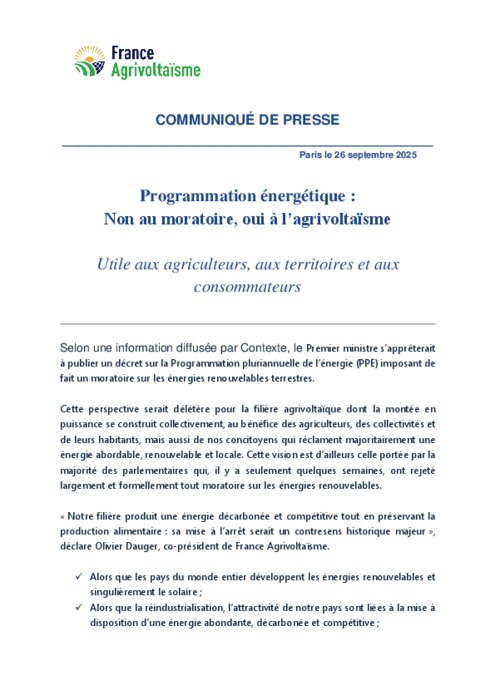 Selon une information diffusée par Contexte, le Premier ministre s’apprêterait à publier un décret sur la Programmation pluriannuelle de l’énergie (PPE) imposant de fait un moratoire sur les énergies renouvelables terrestres. Cette perspective serait délétère pour la filière agrivoltaïque dont la montée en puissance se construit collectivement, au bénéfice des agriculteurs, des collectivités et de leurs habitants, mais aussi de nos concitoyens qui réclament majoritairement une énergie abordable, renouvelable et locale. Cette vision est d’ailleurs celle portée par la majorité des parlementaires qui, il y a seulement quelques semaines, ont rejeté largement et formellement tout moratoire sur les énergies renouvelables.