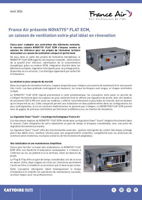 Industriels 21 avril 2026 - 11:23 Conçu pour s’adapter aux contraintes des bâtiments existants, le nouveau caisson NOVATYS FLAT ECM s’impose comme la solution de référence pour les projets de rénovation tertiaire nécessitant un caisson de ventilation compact et performant. PDF (872 Ko) Télécharger credit France AIR