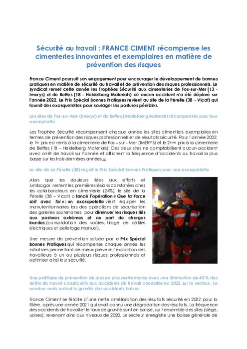 France Ciment poursuit son engagement pour encourager le développement de bonnes pratiques en matière de sécurité au travail et de prévention des risques professionnels. Le syndicat remet cette année les Trophées Sécurité aux cimenteries de Fos-sur-Mer (13 - Imerys) et de Beffes (18 - Heidelberg Materials) où aucun accident n’a été déploré sur l’année 2022. Le Prix Spécial Bonnes Pratiques revient au site de la Pérelle (38 – Vicat) qui fournit des exosquelettes pour soulager les postures pénibles.