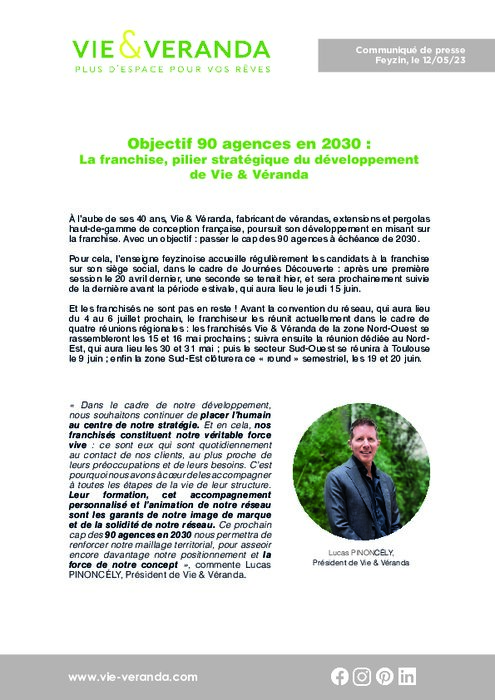 Industriels 12 mai 2023 - 10:42 À l'aube de ses 40 ans, Vie & Véranda, fabricant de vérandas, extensions et pergolas haut-de-gamme de conception française, poursuit son développement en misant sur la franchise. Avec un objectif : passer le cap des 90 agences à échéance de 2030. PDF (500 Ko) Télécharger