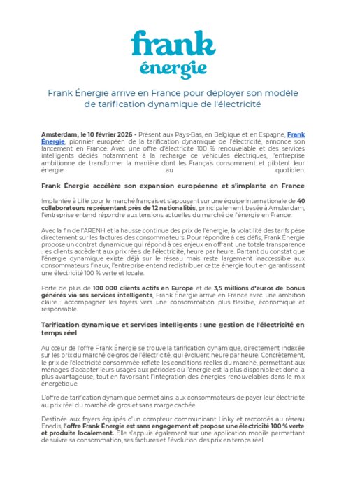 Présent aux Pays-Bas, en Belgique et en Espagne, Frank Énergie, pionnier européen de la tarification dynamique de l’électricité, annonce son lancement en France. Avec une offre d’électricité 100 % renouvelable et des services intelligents dédiés notamment à la recharge de véhicules électriques, l’entreprise ambitionne de transformer la manière dont les Français consomment et pilotent leur énergie au quotidien.