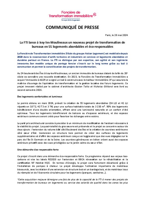 La Foncière de Transformation immobilière (filiale du groupe Action Logement) est mobilisée depuis 2020 dans la reconversion d’actifs tertiaires et industriels en services et logements abordables et durables partout en France. La FTI se distingue par son expertise, son agilité et son ingénierie innovante. Son modèle unique de portage foncier s’inscrit sur le long terme grâce au bail à construction et permet la concrétisation des projets de transformation.