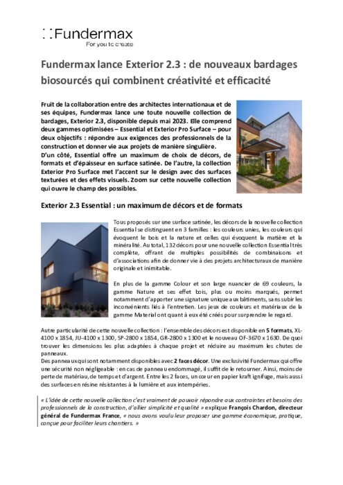 Fruit de la collaboration entre des architectes internationaux et de ses équipes, Fundermax lance une toute nouvelle collection de bardages, Exterior 2.3, disponible depuis mai 2023. Elle comprend deux gammes optimisées – Essential et Exterior Pro Surface – pour deux objectifs : répondre aux exigences des professionnels de la construction et donner vie aux projets de manière singulière.