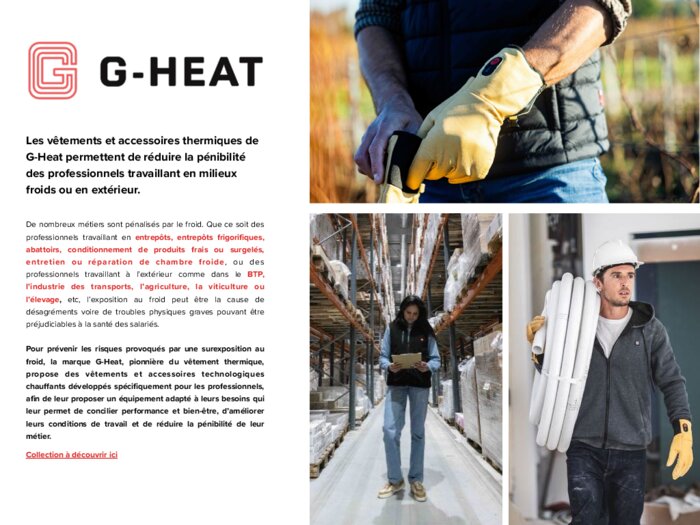 Leader de son secteur, G-Heat développe depuis 2017 des vêtements technologiques, rafraîchissants et chauffants (gants, vestes, chaussettes, semelles...) qui pallient les propres limites du corps humain et permettent à l’utilisateur final - qu’il soit sportif, professionnel ou personne souffrant du froid ou du chaud - de rester maintenu dans de bonnes conditions physiques et de poursuivre son activité en toute sérénité, confort et performance.