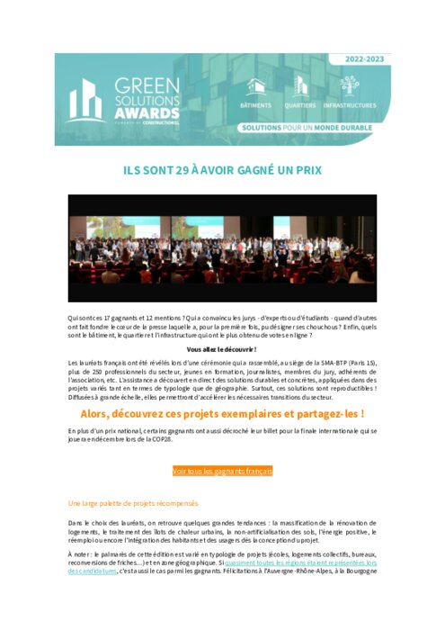 Les lauréats français ont été révélés lors d'une cérémonie qui a rassemblé, au siège de la SMA-BTP (Paris 15), plus de 250 professionnels du secteur, jeunes en formation, journalistes, membres du jury, adhérents de l'association, etc. L'assistance a découvert en direct des solutions durables et concrètes, appliquées dans des projets variés tant en termes de typologie que de géographie.