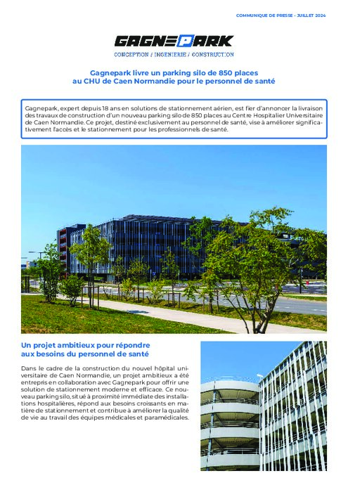Gagnepark, expert depuis 18 ans en solutions de stationnement aérien, est fier d’annoncer la livraison des travaux de construction d’un nouveau parking silo de 850 places au Centre Hospitalier Universitaire de Caen Normandie. Ce projet, destiné exclusivement au personnel de santé, vise à améliorer significativement l’accès et le stationnement pour les professionnels de santé.