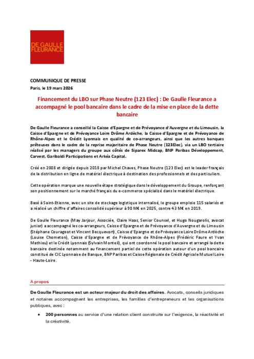 De Gaulle Fleurance a conseillé la Caisse d’Epargne et de Prévoyance d’Auvergne et du Limousin, la Caisse d’Epargne et de Prévoyance Loire Drôme Ardèche, la Caisse d’Epargne et de Prévoyance de Rhône-Alpes et le Crédit Lyonnais en qualité de co-arrangeurs, ainsi que les autres banques prêteuses dans le cadre de la reprise majoritaire de Phase Neutre (123Elec), via un LBO tertiaire réalisé par les managers du groupe aux côtés de Siparex Midcap, BNP Paribas Développement, Carvest, Garibaldi Participations et Arkéa Capital.
