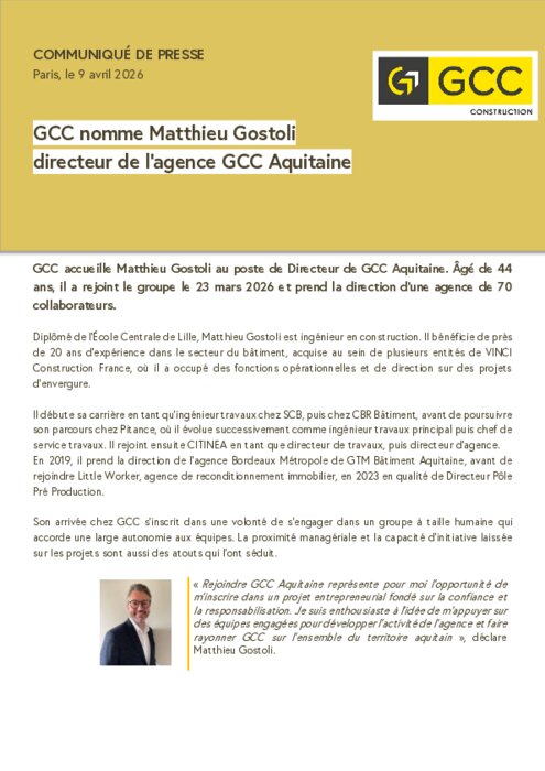 Distributeurs 09 avril 2026 - 11:03 GCC accueille Matthieu Gostoli au poste de Directeur de GCC Aquitaine. Âgé de 44 ans, il a rejoint le groupe le 23 mars 2026 et prend la direction d’une agence de 70 collaborateurs. PDF (72 Ko) Télécharger credit GCC