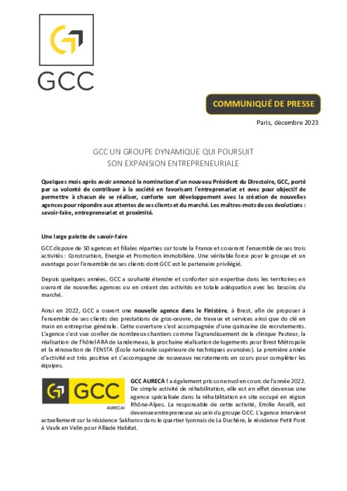 Quelques mois après avoir annoncé la nomination d'un nouveau Président du Directoire, GCC, porté par sa volonté de contribuer à la société en favorisant l'entreprenariat et avec pour objectif de permettre à chacun de se réaliser, conforte son développement avec la création de nouvelles agences pour répondre aux attentes de ses clients et du marché. Les maîtres-mots de ces évolutions : savoir-faire, entrepreneuriat et proximité.