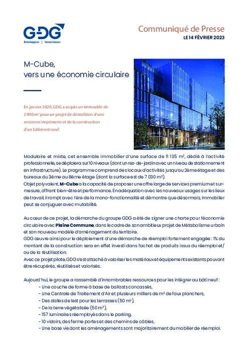 En janvier 2020, GDG a acquis un immeuble de 2 900 m2 pour un projet de démolition d’une ancienne imprimerie et de la construction d’un bâtiment neuf. Au cœur de ce projet, la démarche du groupe GDG a été de signer une charte pour l’économie circulaire avec Plaine Commune, dans le cadre de son ambitieux projet de Métabolisme urbain et son nouveau modèle d’aménagement du territoire.