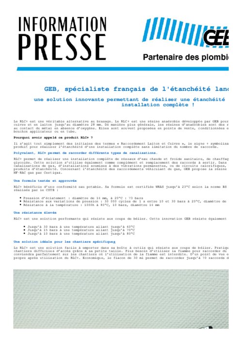 Le RLC+ est une véritable alternative au brasage. Le RLC+ est une résine anaérobie développée par GEB pour l’étanchéité des raccords lisses en cuivre et en laiton jusqu’au diamètre 28 mm. De manière plus générale, les résines d’anaérobies sont des résines d’étanchéité qui polymérisent au contact du métal en absence d’oxygène.
