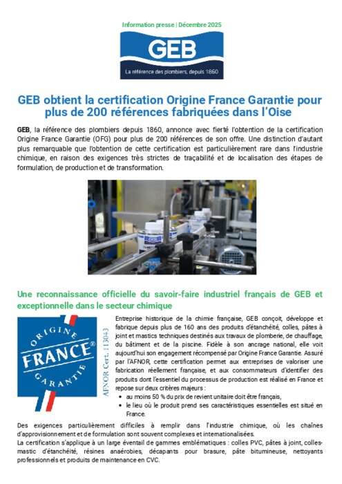 GEB, la référence des plombiers depuis 1860, annonce avec fierté l’obtention de la certification Origine France Garantie (OFG) pour plus de 200 références de son offre. Une distinction d’autant plus remarquable que l’obtention de cette certification est particulièrement rare dans l’industrie chimique, en raison des exigences très strictes de traçabilité et de localisation des étapes de formulation, de production et de transformation.