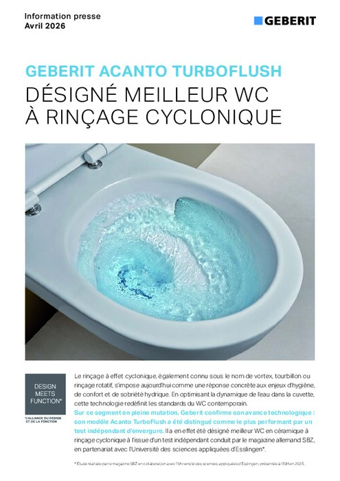 Le rinçage à effet cyclonique, également connu sous le nom de vortex, tourbillon ou rinçage rotatif, s’impose aujourd’hui comme une réponse concrète aux enjeux d’hygiène, de confort et de sobriété hydrique. En optimisant la dynamique de l’eau dans la cuvette, cette technologie redéfinit les standards du WC contemporain. Sur ce segment en pleine mutation, Geberit confirme son avance technologique : son modèle Acanto TurboFlush a été distingué comme le plus performant par un test indépendant d’envergure. Il a en effet été désigné meilleur WC en céramique à rinçage cyclonique à l’issue d’un test indépendant conduit par le magazine allemand SBZ, en partenariat avec l’Université des sciences appliquées d’Esslingen.