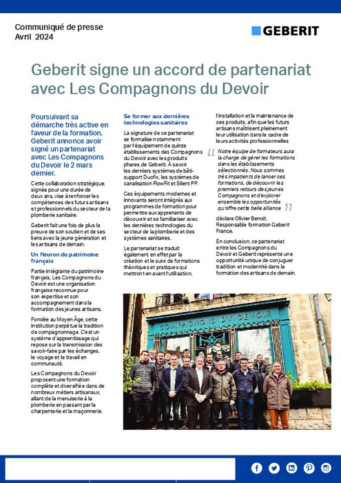 Poursuivant sa démarche très active en faveur de la formation, Geberit annonce avoir signé un partenariat avec Les Compagnons du Devoir le 2 mars dernier.