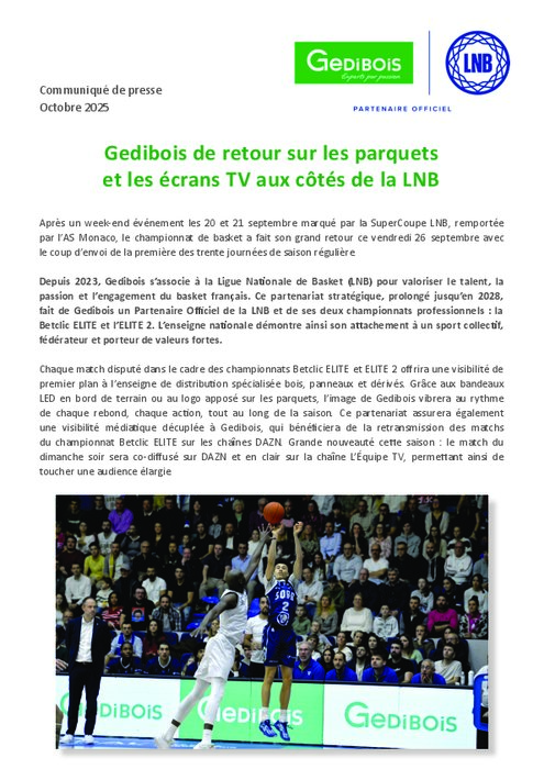 Depuis 2023, Gedibois s’associe à la Ligue Nationale de Basket (LNB) pour valoriser le talent, la passion et l’engagement du basket français. Ce partenariat stratégique, prolongé jusqu’en 2028, fait de Gedibois un Partenaire Officiel de la LNB et de ses deux championnats professionnels : la Betclic ELITE et l’ELITE 2. L’enseigne nationale démontre ainsi son attachement à un sport collectif, fédérateur et porteur de valeurs fortes.