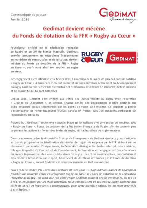 Fournisseur officiel de la Fédération Française de Rugby et du XV de France Masculin, Gedimat, premier groupement de négociants indépendants en matériaux de construction et de bricolage, devient mécène du Fonds de dotation de la FFR « Rugby au Cœur », confirmant ainsi son soutien au rugby amateur.