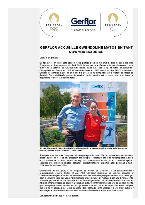 Gerflor est heureux de vous annoncer son partenariat avec une athlète dans le cadre des Jeux Olympiques et Paralympiques de Paris 2024. La marque de revêtements de sols et muraux est ravie d'accueillir la joueuse de Goalball Gwendoline Matos dans ses rangs en tant qu'ambassadrice.