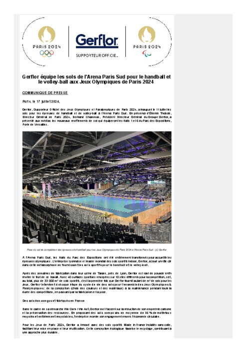 Gerflor, Supporteur Officiel des Jeux Olympiques et Paralympiques de Paris 2024, a inauguré le 11 juillet les sols pour les épreuves de handball et de volley-ball à l'Arena Paris Sud. En présence d'Étienne Thobois, Directeur Général de Paris 2024, Bertrand Chammas, Président Directeur Général du Groupe Gerflor, a présenté aux médias les nouveaux revêtements de sol qui équiperont les Halls 1 et 6 du Parc des Expositions, Porte de Versailles.