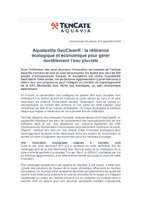 Avec l’infiltration des eaux pluviales, l’innovation bio-inspirée de TenCate AquaVia convainc de plus en plus de territoires. En quatre ans, plus de 250 projets d’infrastructures français et européens ont choisi l’aquatextile GeoClean. Cette année, Val de Garonne Agglomération (Lot-et-Garonne) a même revu son programme pour l’intégrer au chantier de réaménagement de la ZAC Marmande Sud. Parmi ses avantages, un gain économique déterminant.